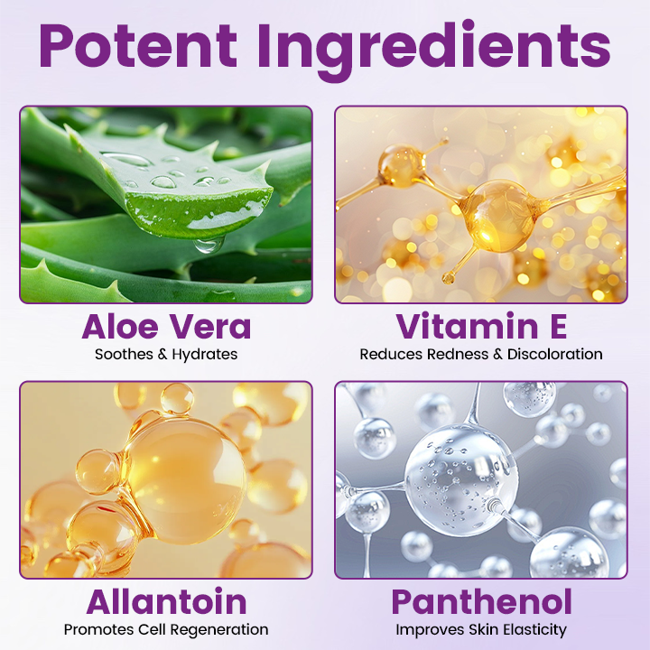 â Aloe Vera â Soothes & Hydrates:Â Aloe Vera is widely known for its natural healing power. Rich in antioxidants and vitamins, it calms irritated skin, reduces dryness, and provides long-lasting hydration â creating the ideal environment for scar recovery.