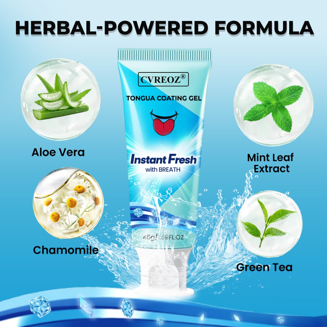 Formulated with a natural herbal complex of Mint Leaf Extract, Aloe Vera, Chamomile, and Green Tea, Cvreoz® gently dissolves tongue buildup and neutralizes odor-causing bacteria without the use of harsh chemicals. This soothing botanical blend provides a triple-action effect: