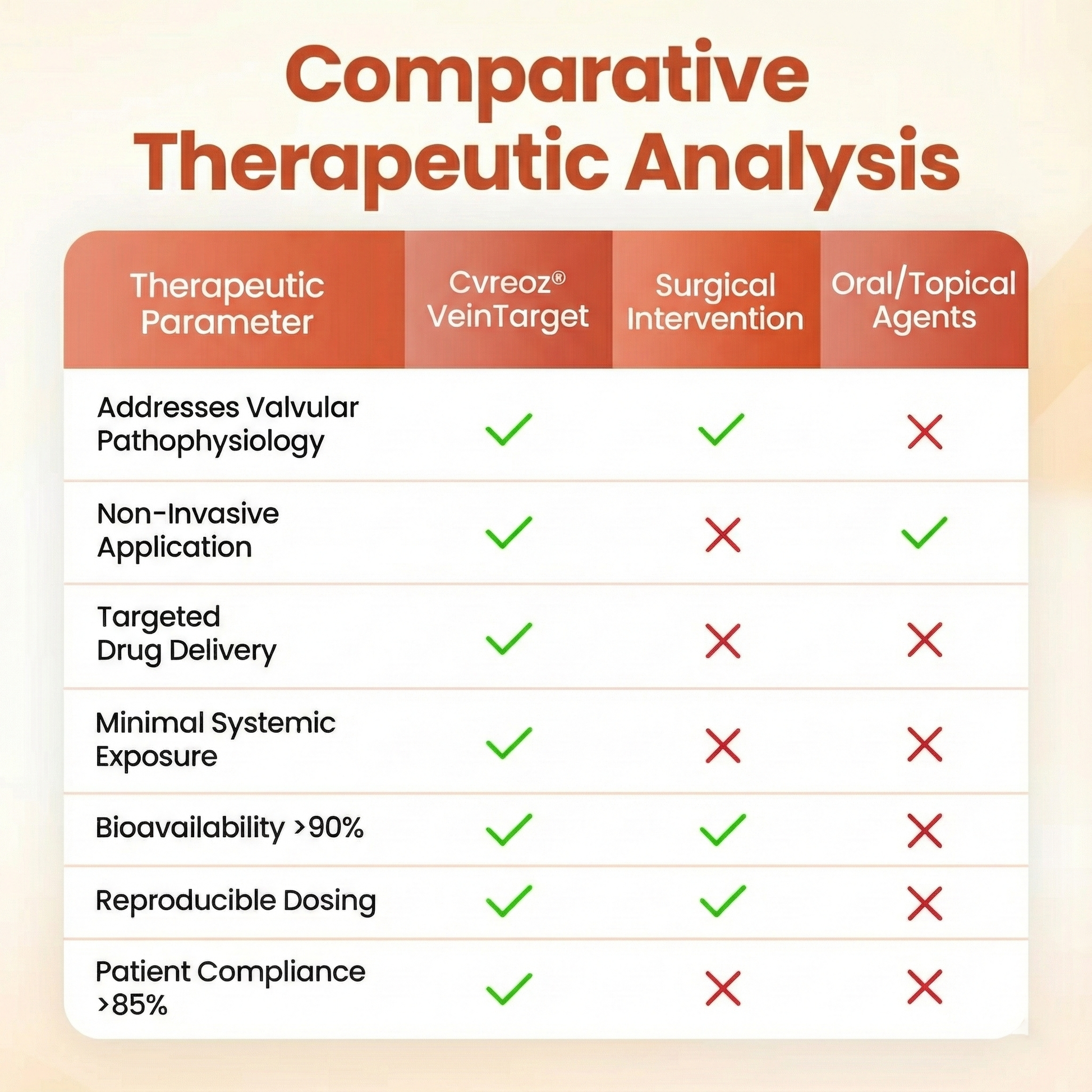 Cvreoz® VeinTarget represents the first commercially available transdermal phytotherapy system specifically designed to address venous valvular insufficiency through localized botanical intervention. Unlike systemic treatments that dilute active compounds throughout the circulatory system or topical applications that cannot penetrate the dermal barrier, our microneedle delivery system ensures concentrated therapeutic compounds reach the target tissue with minimal systemic exposure.