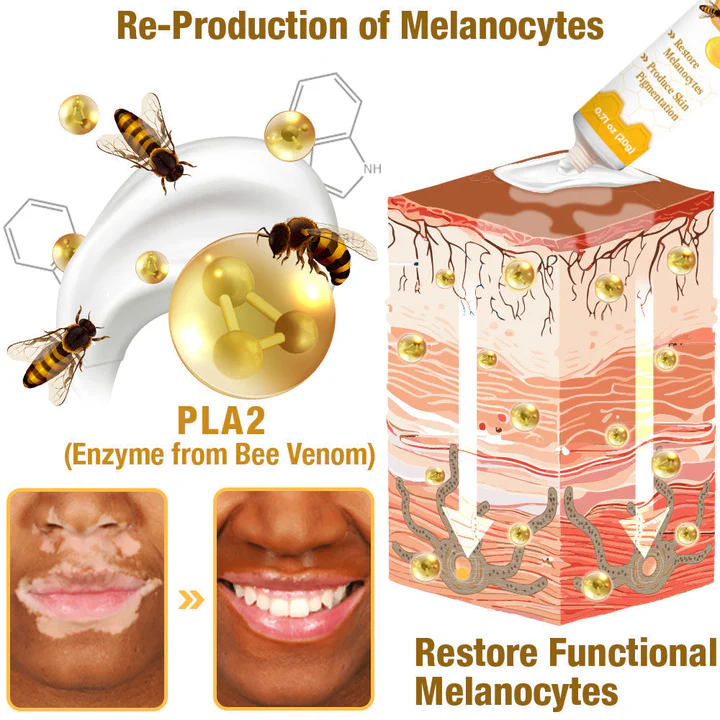 Through extensive research in recent decades, the major enzyme of Bee Venom, PLA2, has emerged as a promising approach for addressing various skin conditions, including vitiligo. In vitiligo, where melanocytes are destroyed, the VitiGO Bee Venom cream is formulated to promote re-pigmentation by suppressing the immune response responsible for attacking melanocytes. With this evidence, VitiGO offers a compelling solution to effectively address vitiligo and restore natural skin pigmentation.